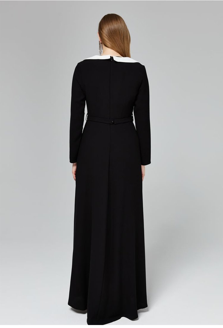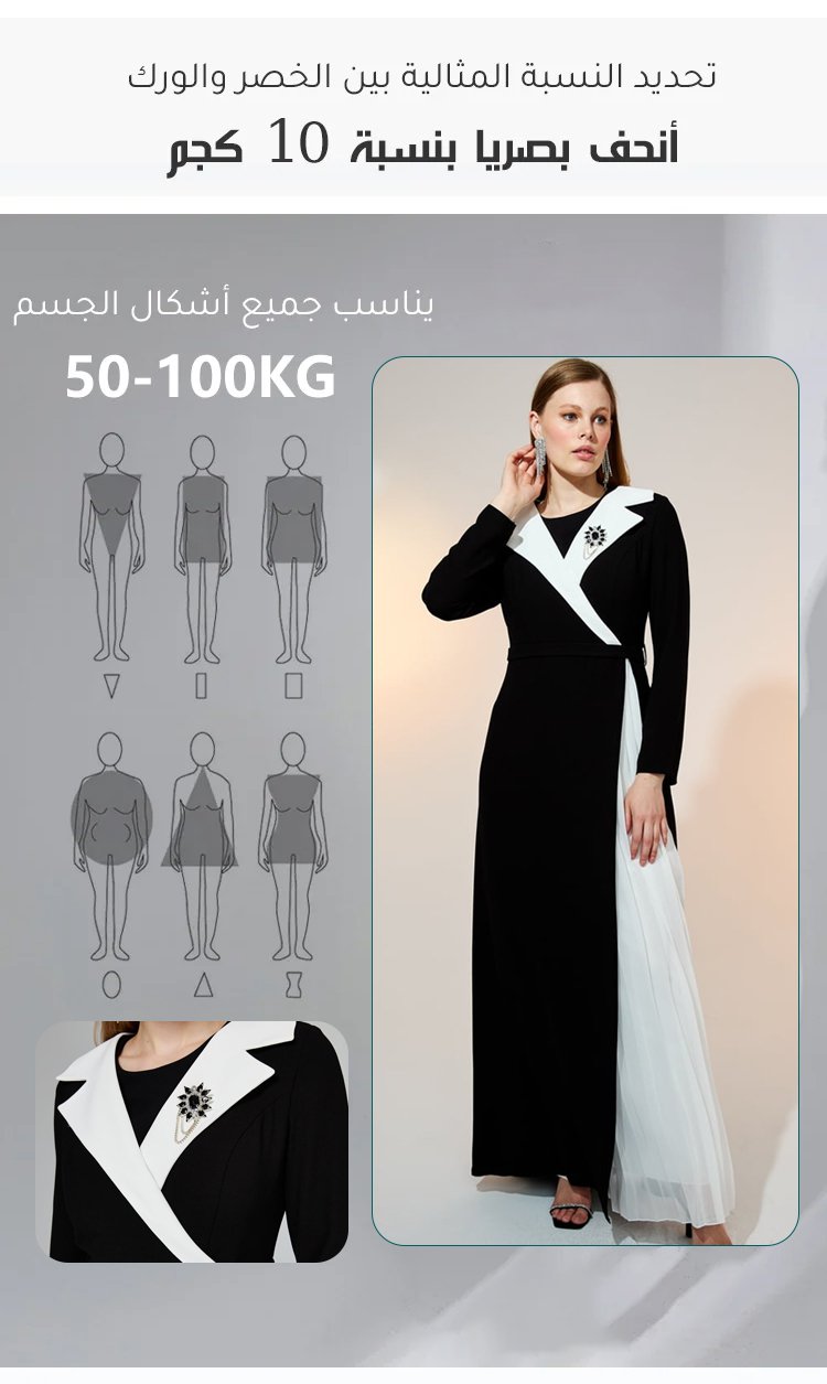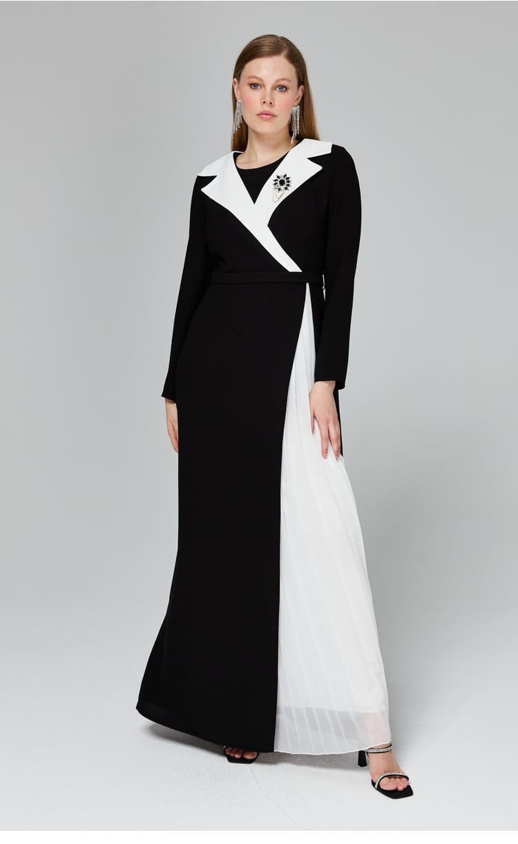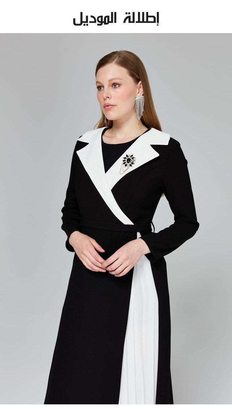 فستان طويل راقي بألوان متباينة وطيات أنيقة جذابة
